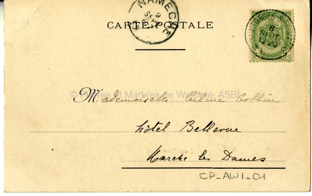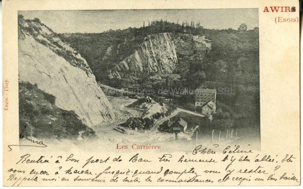 Carte postale timbrée des carrières à ciel ouvert d’Awir (Engis), section communale de Flémalle. Carrière de calcaire du viséen. Extrait du courrier : « Chère Céline, Rentrée à bon port de (?) très heureuse d’y être allée. Êtes-vous encore à Marche. Jusque quand comptez-vous y rester ? Rappelle moi au souvenir de toutes les connaissance et reçois un bon baiser. Emma » Année du cachet de la poste : 1920. Dimensions : 89 x 140 mm. Type de support : papier cartonné. Éditeur de cartes postales et lieu d’édition : Thiry – Engis.
