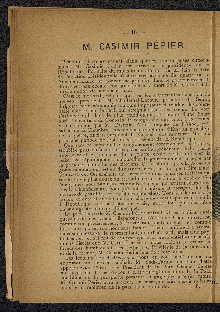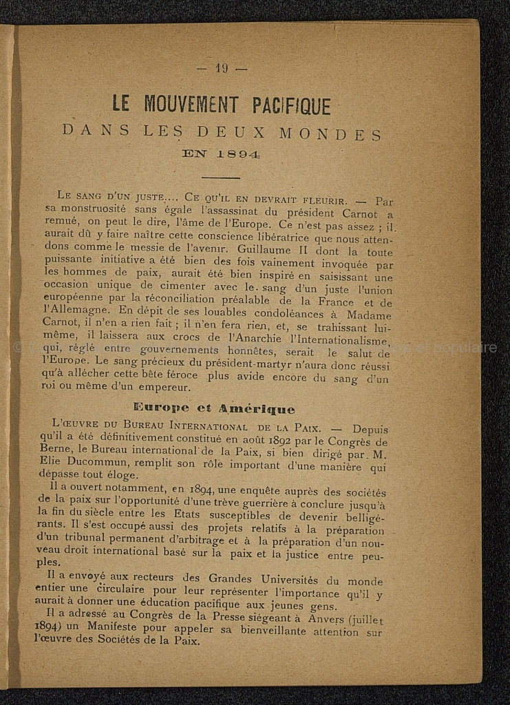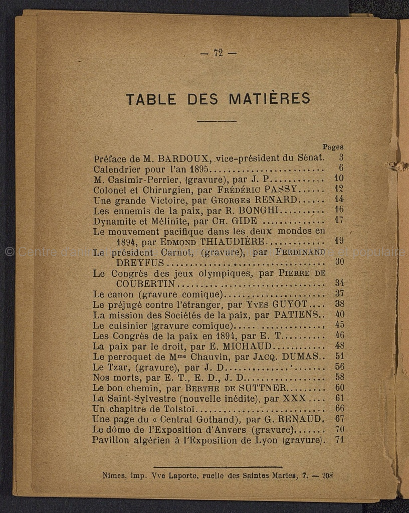 Brochure imprimée et illustrée de 78 pages. Préface de M. Bardoux, Vice-président du Sénat; Calendrier pour 1895; M. Casimir-Perrier (gravure) par J.P.; Colonel et Chirurgien par Frédéric Passy; Une grande Victoire, par Geroges Renard; Les ennemis de la paix, par R. Bonghi; Dynamite et Métilique, par Ch. Gide; le mouvement pacifique dans les deux mondes en 1894, par Emond Thaudière; Le président Carnot (gravure), par Ferdinand Dreyfus; Le Congrès des jeux olympiques, par Pierre de Coubertin; Le canon (gravure comique); Le préjugé contre l'étranger, par Yves Guyot; La Mission de la paix, par Patiens; Le cuisinier (gravure comique); Les Congrès de la paix en 1894, par E.T.; La paix par le droit, par E. Michaud; Le perroquet de Mme Chauvin, Par Jacq. Dumas; Le Tsar (gravure), par J.D.; Nos morts, par E.T., E.D., J.D.; Le bon chemin, par Berthe De Suttner; La Sint-Sylvestre (nouvelle inédite), par XXX;Un chapitre de Tolstoï; Une page du "Central Gothand", par G. Renaud; Le dôme de l'Exposition d'Anvers (gravure); Pavillon algérien à l'Exposition de Lyon (gravure)