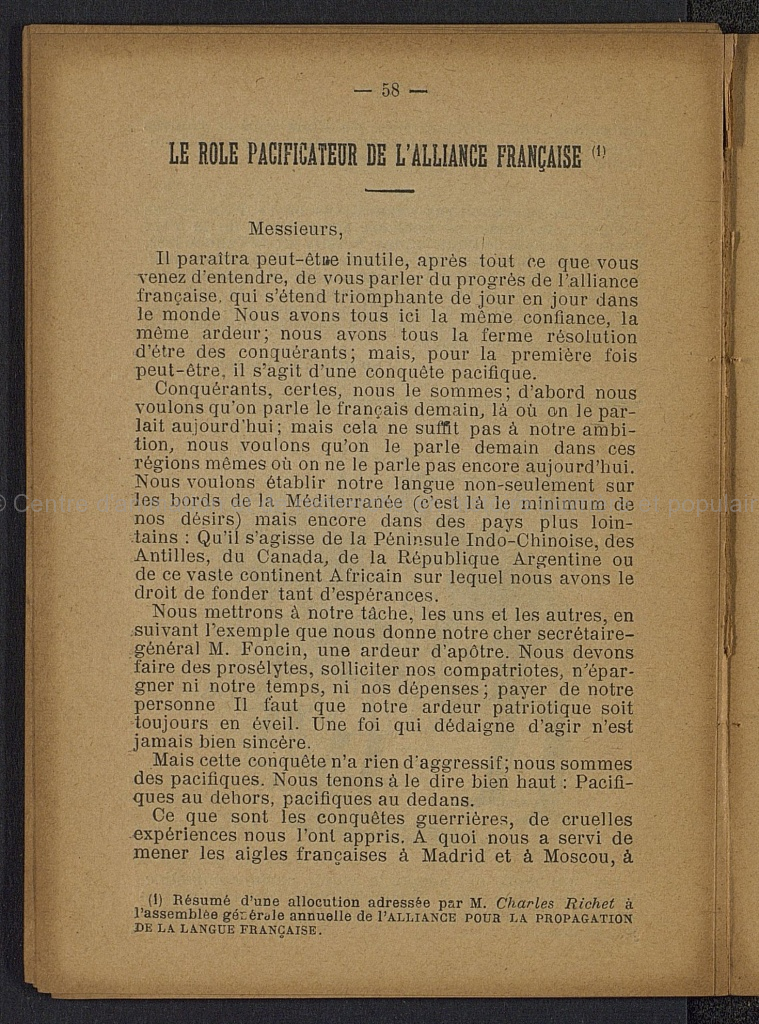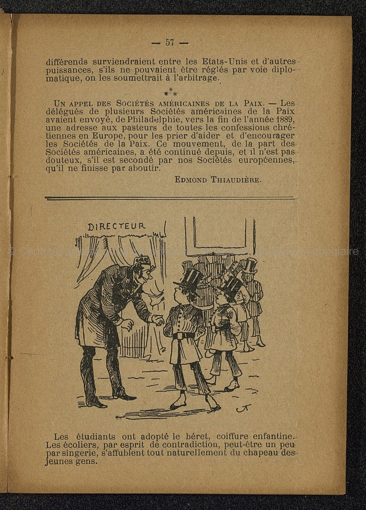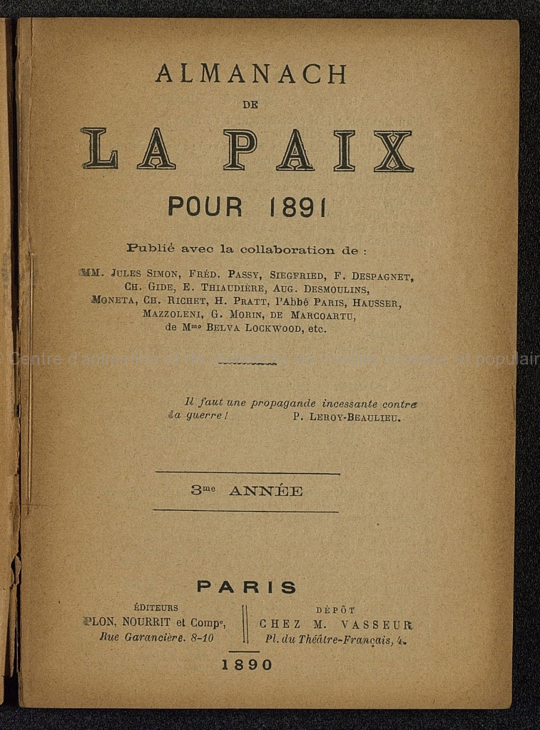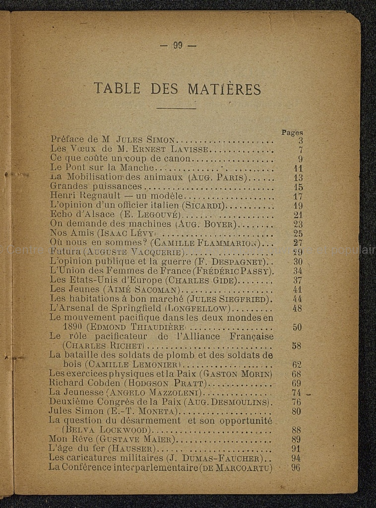 Brochure imprimée et illustrée de 90 pages. Préface de M. Jules Simon; Les vœux de M. Ernest Lavisse; ce que coûte un coup de canon; Le pont sur la Manche; La Mobilistaion des animaux (Aug. Paris); Grandes puissances; Henri Regnault - un modèle; L'opinion d'un officier italien (Sicardi); Echo d'Alsace (E. Legouvé); On demande des machines (Aug. Boyer); Nos amis (Isaac Levy); Où nous en sommes? (Camille Flammarion); Futura (Auguste Vacquerie); L'opinion publique et la guerre (F. Despagnet); l'Union des Femmes de France (Frédéric Passy); Les Etats-Unis d'Europe (Ch. Gide); Les jeunes (Aimé Sacoman); Les habitants à bon marché (Jules Siegfried); l'Arsenal de Springfield (Longfellow); Le mouvement pacifique dans les deux mondes en 1890 (Edmond Thaudière); Le rôle pacificateur de l'Alliance Française (Charles Richet); La bateille des soldats de plomb et des soldats de bois (Camille Lemonnier); Les exercices physiques et la paix (Gaston morin); Ggérard Cobben (Hogdson Pratt); La jeunesse (Angelo Mazolleni); Deuxième Congrès de la Paix (Aug. Desmoulins); Jules Simon (E.T. Moneta); La question du désarmement et son opportunité (Belva Lockwood); Mon rêve (Gustave Maier); L'âge du fer (Huasser); les caricatures militaires (J. Dumas-Faucher); la conférence interparlementaire (De Marcoartu)