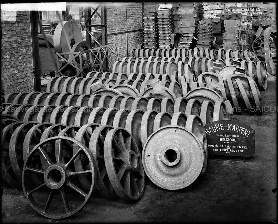 Cliché sur verre en noir et blanc. Présence du panneau enseigne : "Baume-Marpent. Haine Saint Pierre. Belgique. Ponts et Charpentes. Matériel roulant". |