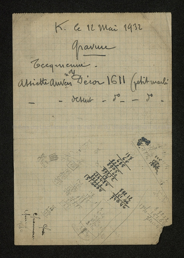 Note manuscrite relative à un décor. Papier recto verso, dimension 14 x 19 cm
