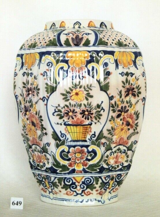 Vase potiche au décor polychrome. Dimensions : Diamètre de la base en cm : 13,2 ; Diamètre en cm : 11,3 ; Hauteur en cm : 29,5. Matériaux et techniques : Faïence fine. Impression des contours, rehauts de peinture. |