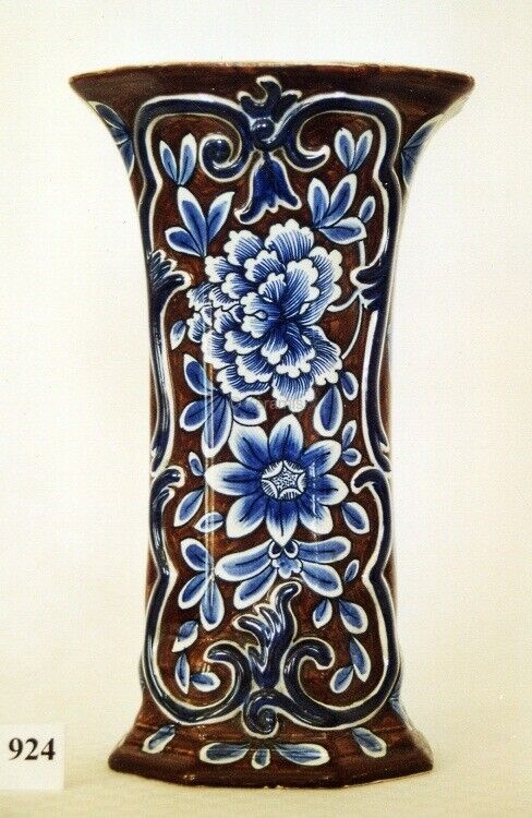 Vase cornet de section rectangulaire. Dimensions : Diamètre de la base en cm : 10,7 x 10 ; Diamètre du col en cm : 13,3 x 11,8 ; Hauteur en cm : 22,6. Matériaux et techniques : Impression des contours, rehauts de peinture et grattage d'un motif dans la couleur du fond. |