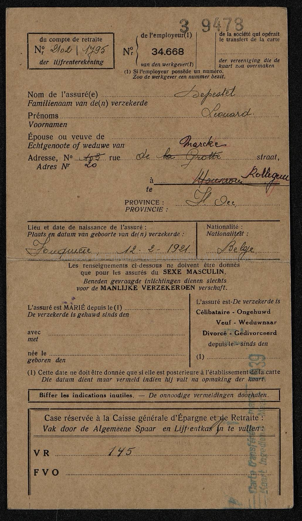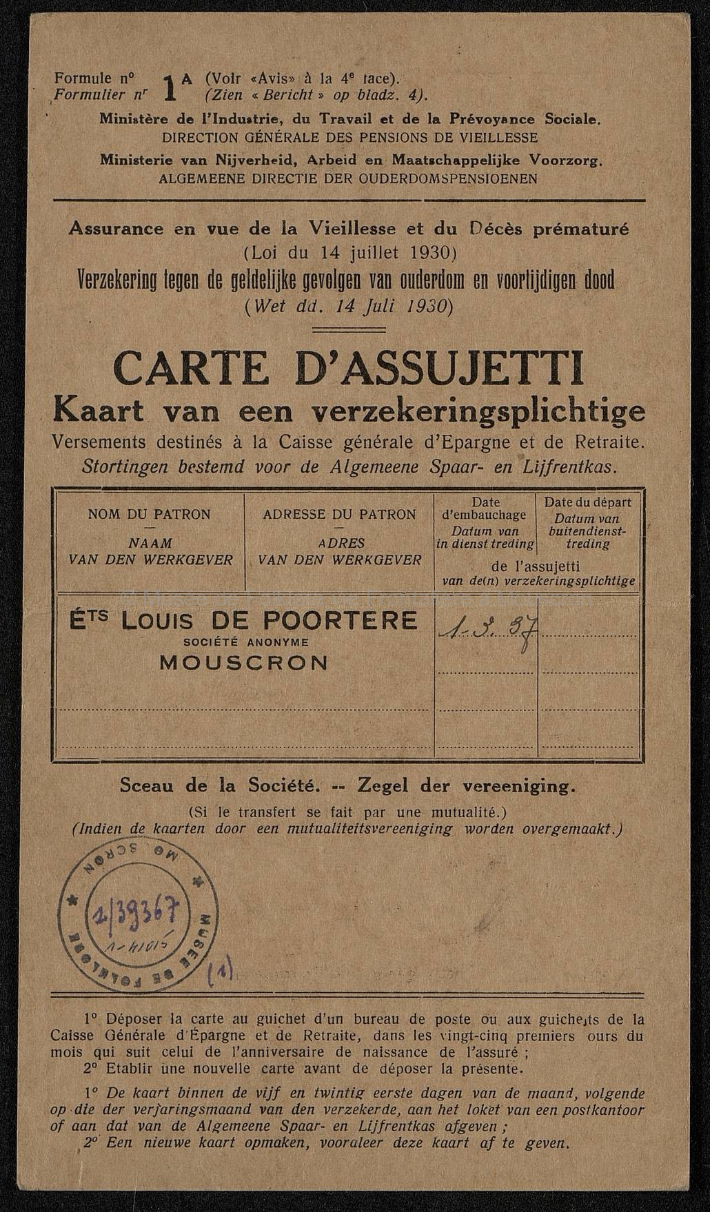 Carte d'assurance obligatoire en vue de la vieillesse ou du décès prématuré. Carte imprimée et manuscrite. Cachets en couleurs. Dimensions : 21,5 x 12 cm.