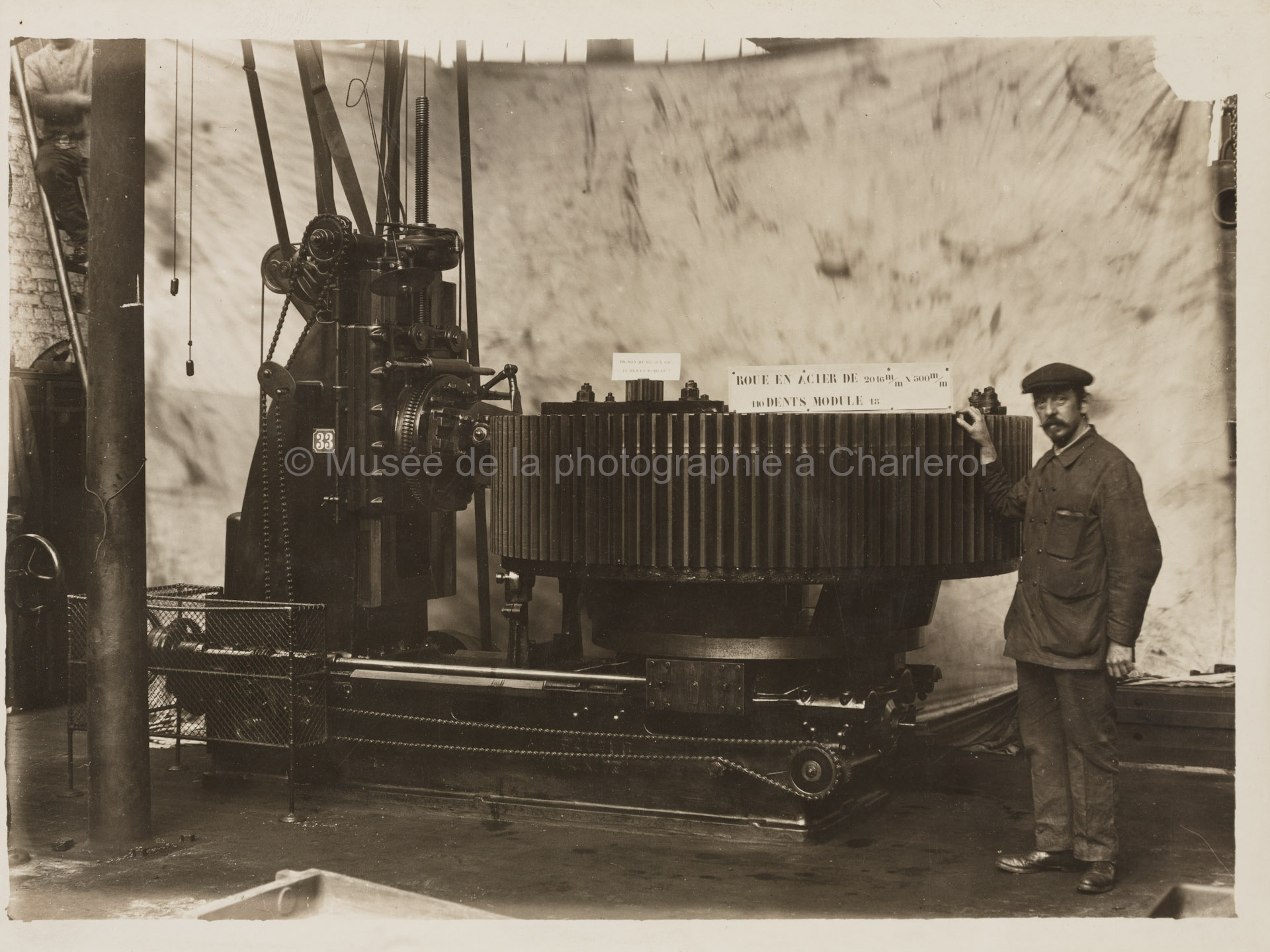 "A196. Cutting of 110T.-Mod.18 Spur Gears." Ouvrier la main posée sur une roue à 110 dents |