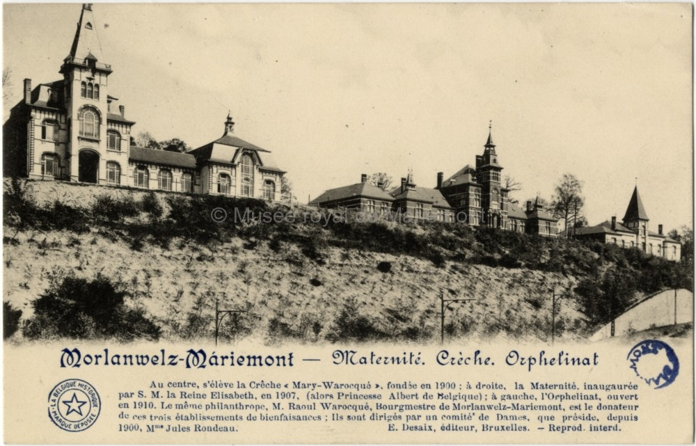 Maternité. Crèche. Orphelinat. Collection: La Belgique historique. Descriptif du monument imprimé sur la carte. Carte postale. Tirage antérieur à 1910. Dimension : 90 x 139 mm. |