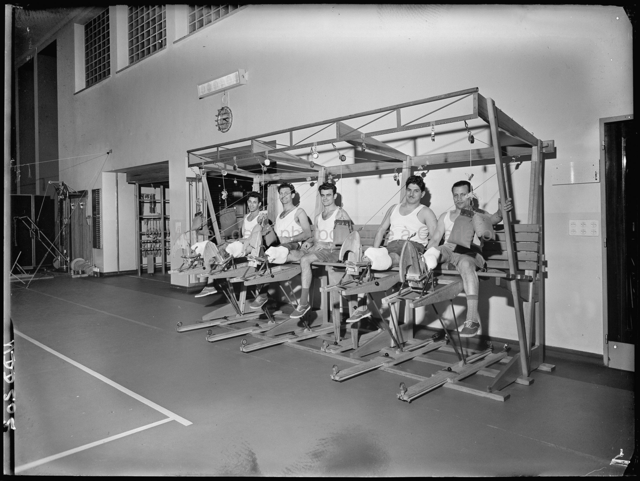 Groupe de cinq patients en séance de réadaptation sur une machine commune |
